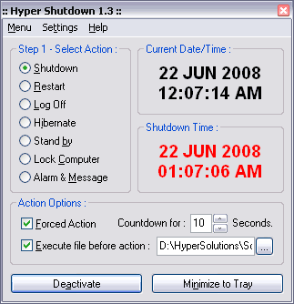 | Description: | A simple and effective timer which performs the selected action at the specified time. Support actions are : Shutdown, Restart, Logoff, Hibernate, Standby, Lock PC, Alarm & Message. Optionally, It can also forcefully terminate all running processes before performing the selected action. The new Alarm feature supports all popular Audio and Video formats such as mp3, wav, wma, avi, mpg files |